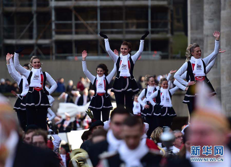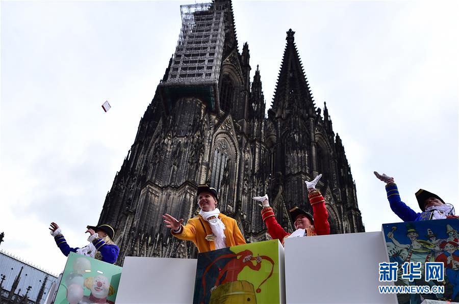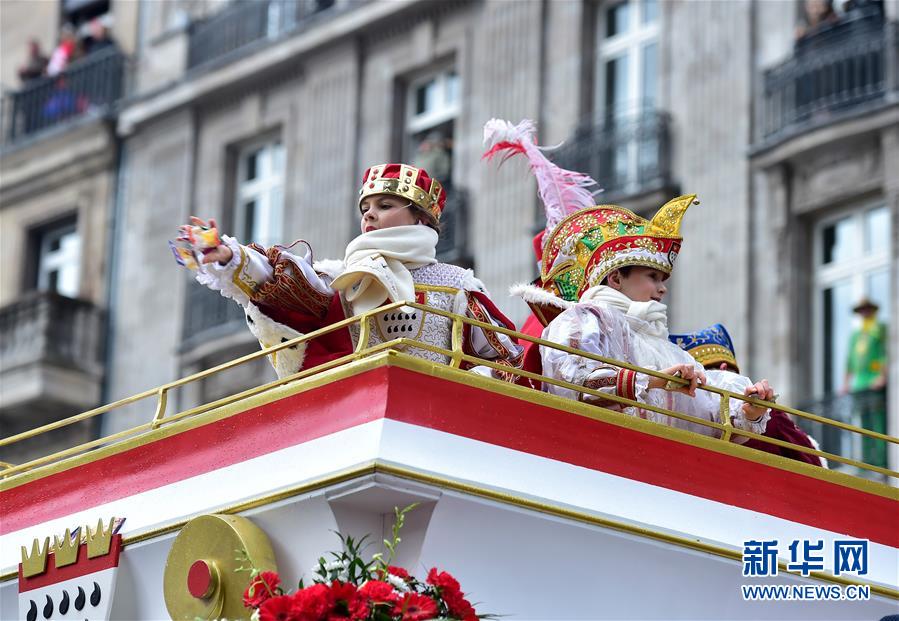 3月4日,在德国科隆,人们在狂欢节“玫瑰星期一”大游行时向观众抛掷糖果表达祝福。 当日,科隆狂欢节迎来“玫瑰星期一”大游行,将德国规模最大的狂欢节推向高潮。 新华社记者逯阳摄