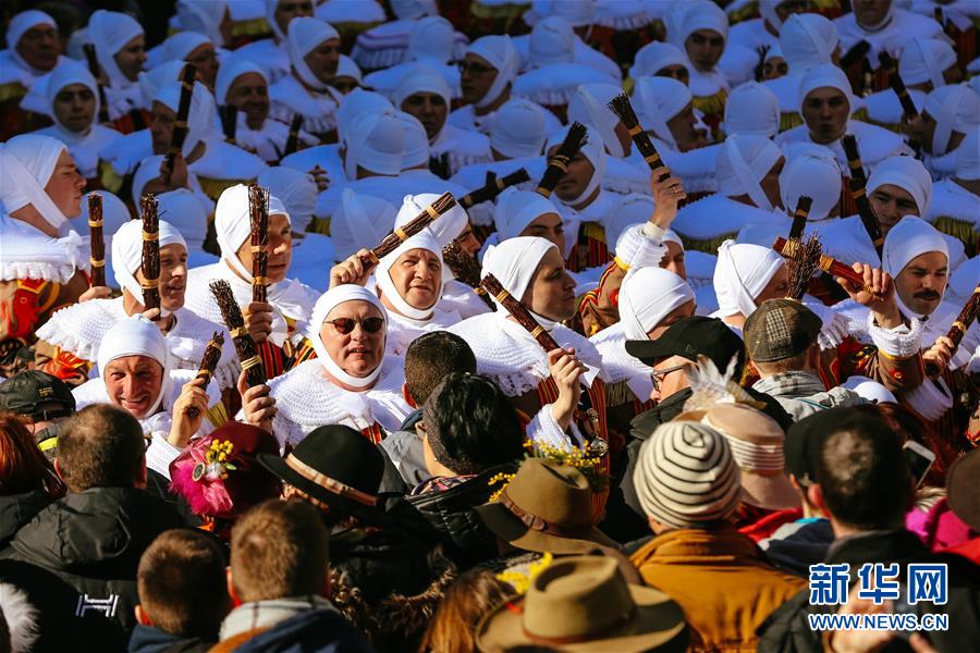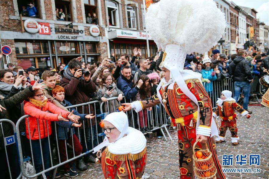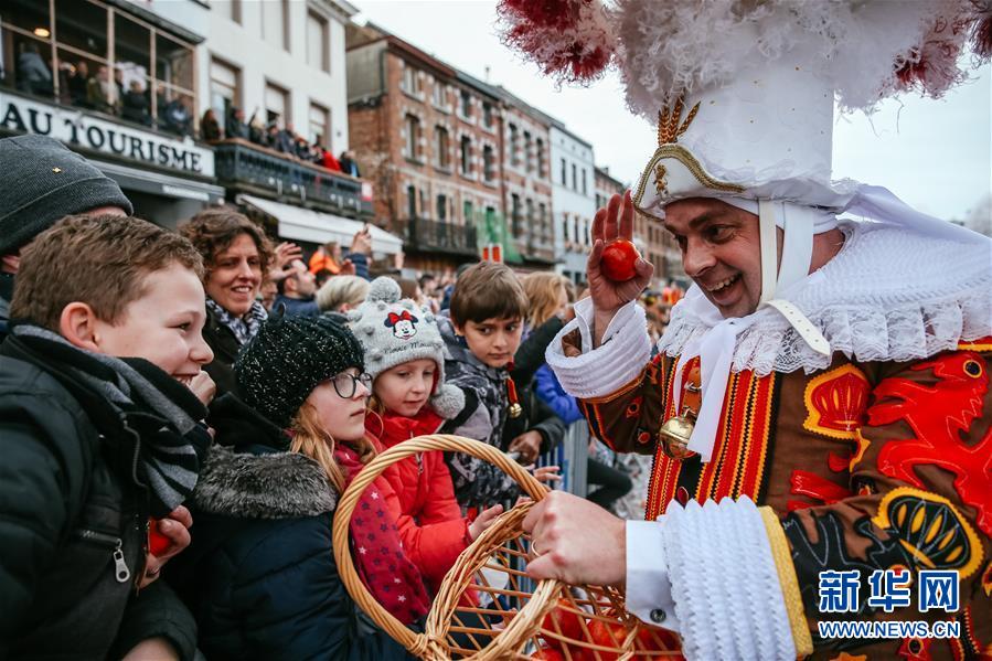 3月5日,在比利时南部小镇班什,当地居民装扮成“憨人”形象,在游行中向游客扔血橙。据说,血橙代表祝福,接到或被扔到的人都会交好运。 当日是2019年比利时班什狂欢节的最后一天,也是高潮部分。起源于中世纪的班什狂欢节寓意辞旧迎新,并于2003年11月被列入联合国教科文组织非物质文化遗产名录。班什当地居民打扮成“憨人”“水手”“农夫”“小丑”等形象,和游客一起参与狂欢。“憨人”是吉祥与快乐的代言人,也是班什狂欢节最具标志性的形象。 新华社记者 张铖 摄