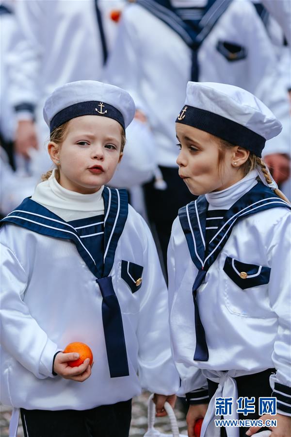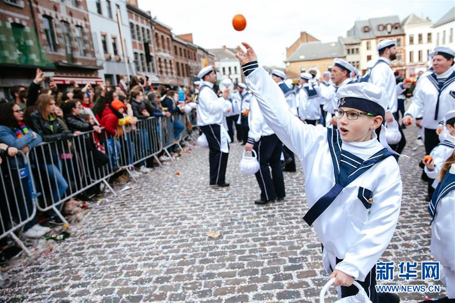 3月5日,在比利时南部小镇班什,当地居民装扮成“水手”形象,一边游行一边向游客扔血橙。据说,血橙代表祝福,接到或被扔到的人都会交好运。 当日是2019年比利时班什狂欢节的最后一天,也是高潮部分。起源于中世纪的班什狂欢节寓意辞旧迎新,并于2003年11月被列入联合国教科文组织非物质文化遗产名录。班什当地居民打扮成“憨人”“水手”“农夫”“小丑”等形象,和游客一起参与狂欢。“憨人”是吉祥与快乐的代言人,也是班什狂欢节最具标志性的形象。 新华社记者 张铖 摄