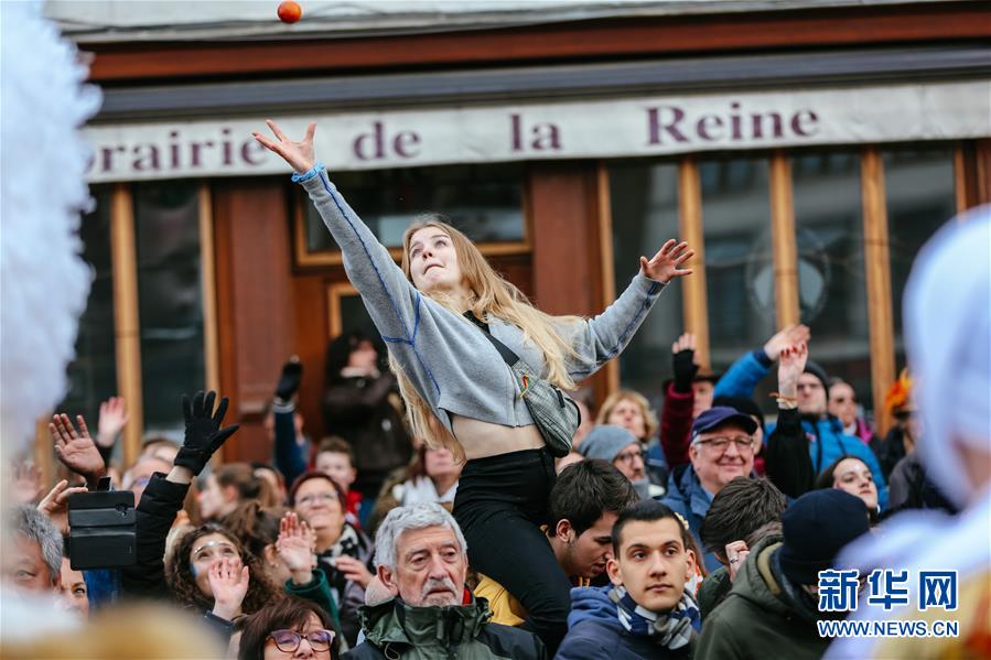 3月5日,在比利时南部小镇班什,观众争抢游行队伍扔出的血橙。据说,血橙代表祝福,接到或被扔到的人都会交好运。 当日是2019年比利时班什狂欢节的最后一天,也是高潮部分。起源于中世纪的班什狂欢节寓意辞旧迎新,并于2003年11月被列入联合国教科文组织非物质文化遗产名录。班什当地居民打扮成“憨人”“水手”“农夫”“小丑”等形象,和游客一起参与狂欢。“憨人”是吉祥与快乐的代言人,也是班什狂欢节最具标志性的形象。 新华社记者 张铖 摄