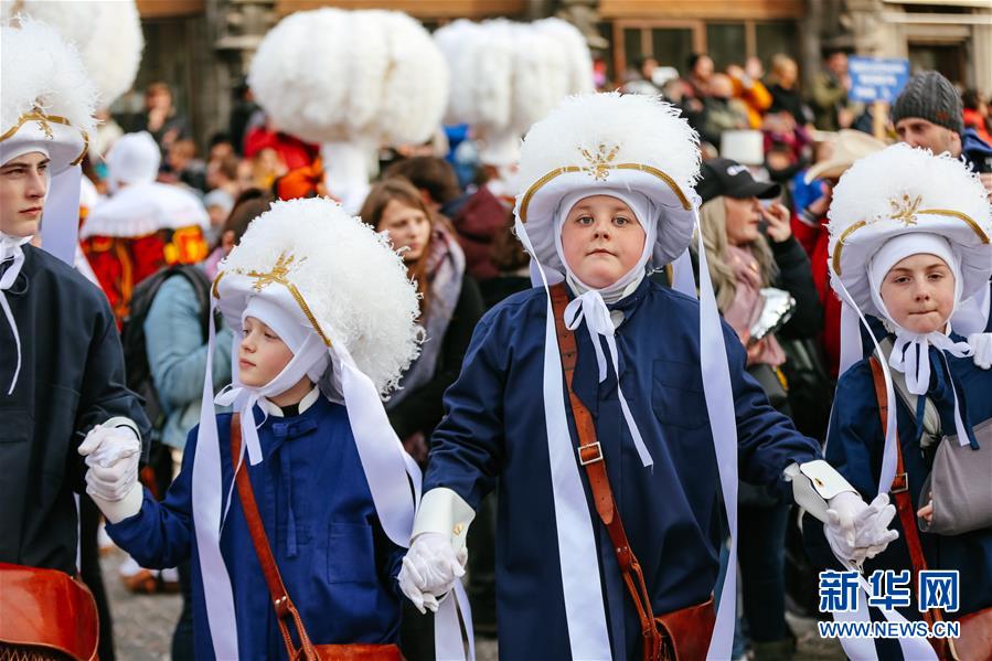 3月5日,在比利时南部小镇班什,小朋友装扮成“水手”形象参加狂欢节。 当日是2019年比利时班什狂欢节的最后一天,也是高潮部分。起源于中世纪的班什狂欢节寓意辞旧迎新,并于2003年11月被列入联合国教科文组织非物质文化遗产名录。班什当地居民打扮成“憨人”“水手”“农夫”“小丑”等形象,和游客一起参与狂欢。“憨人”是吉祥与快乐的代言人,也是班什狂欢节最具标志性的形象。 新华社记者 张铖 摄