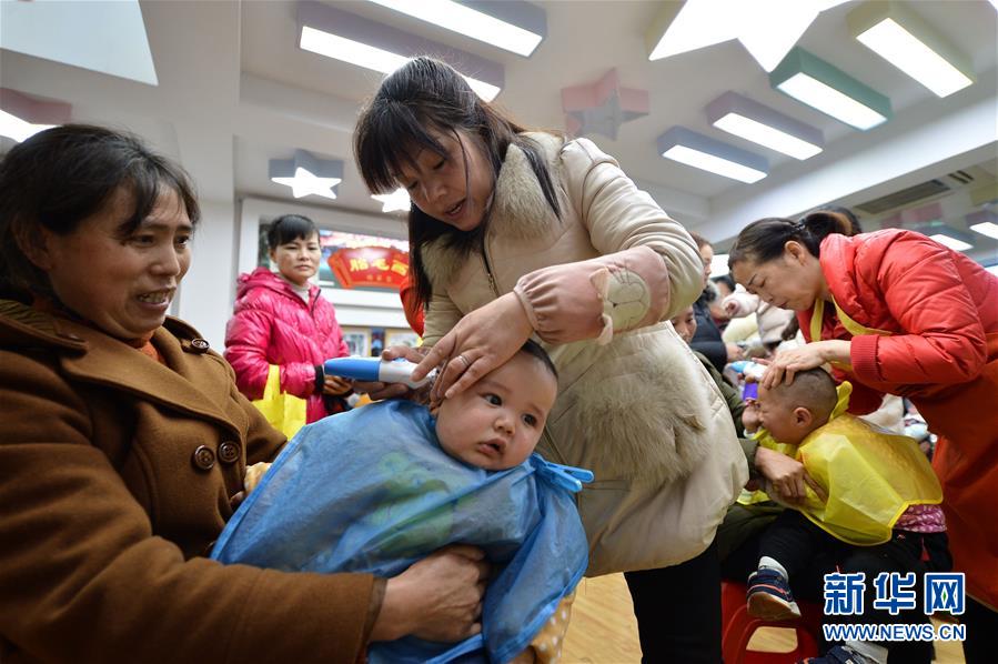 3月8日,在湖北襄阳市保康县一家婴幼儿理发店里,理发师为一名小朋友在“剃龙头”。当日是农历二月初二,民间有“二月二,剃龙头”的传统习俗。 新华社发(杨韬 摄)