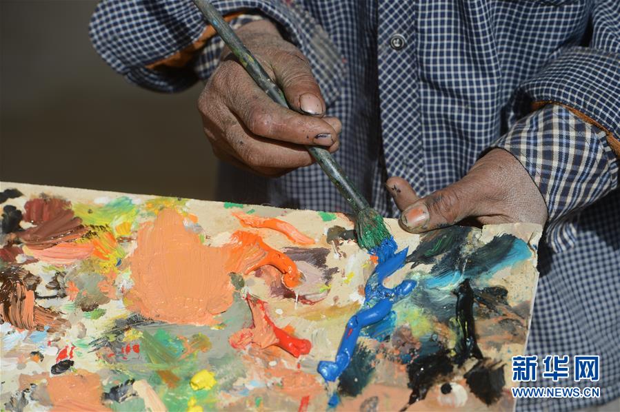 阿卜力克木·麦麦提敏在颜料板上调色(3月5日摄)。
