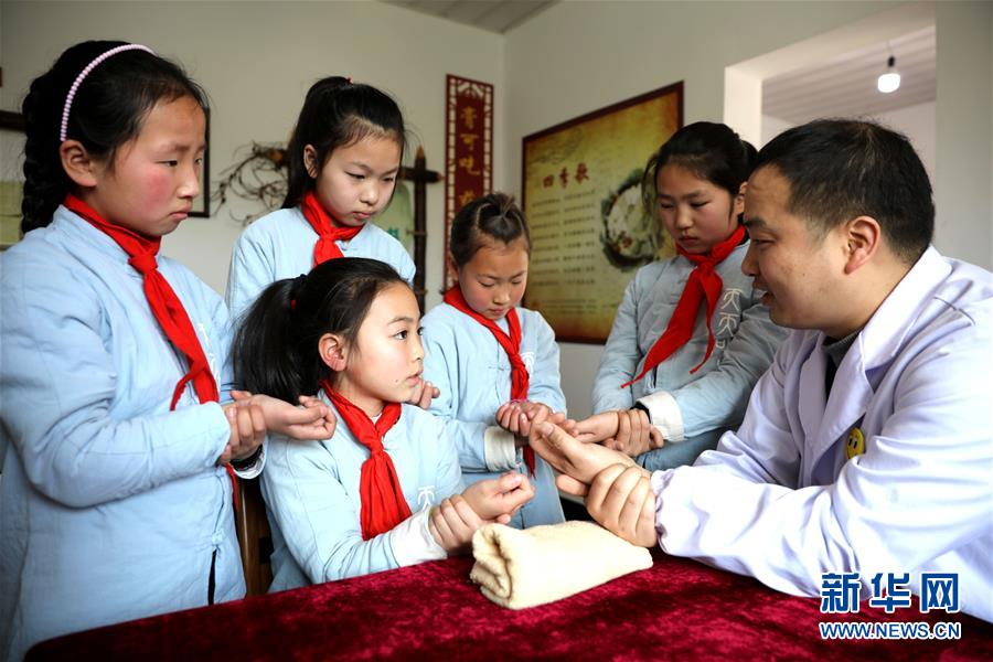 3月14日,长兴县中医院中医师教孩子们中医把脉的知识。 新华社记者 徐昱 摄