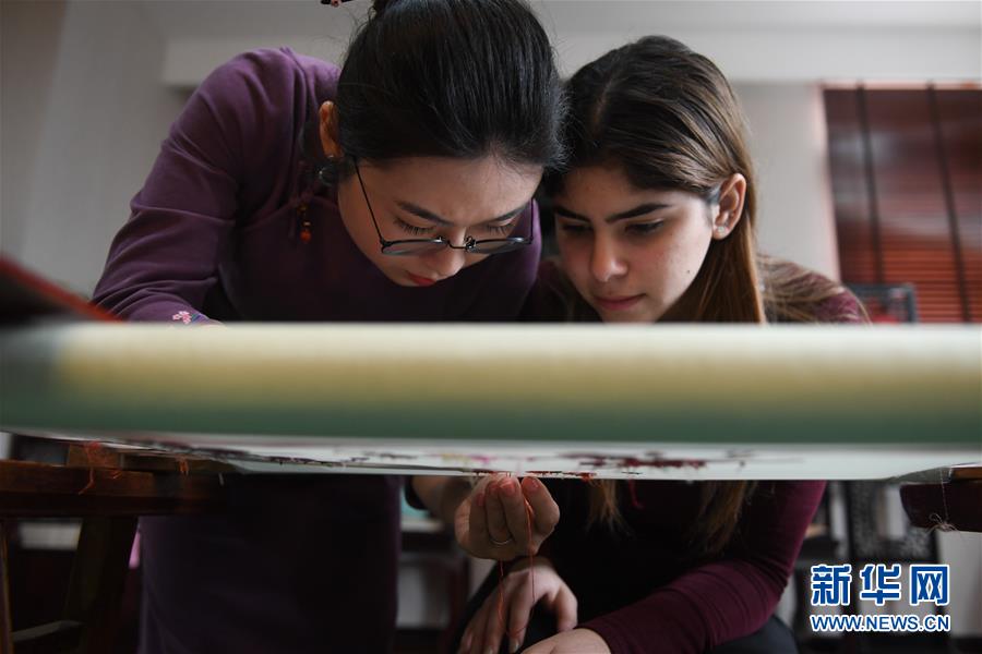 3月14日,在位于苏州吴中区光福镇的向红绣府刺绣艺术工作室,府涵璐在指导巴拿马留学生玛利娅刺绣。新华社记者 季春鹏 摄
