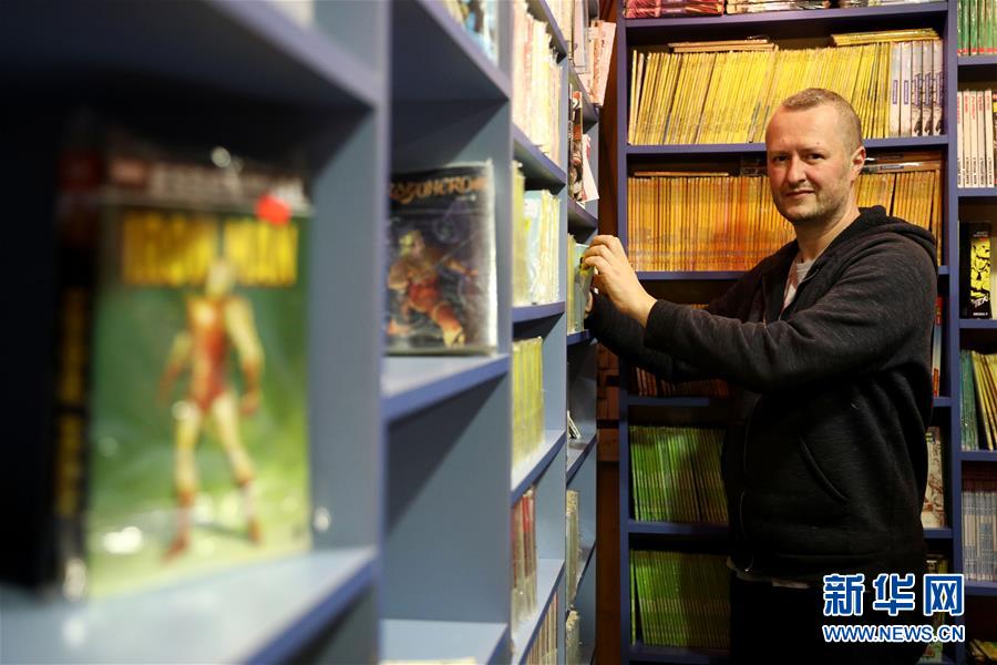 3月11日,在波黑首都萨拉热窝,谢哈里克在整理图书。 波黑首都萨拉热窝的雅戈泰漫画书店毗邻当地的地标景点巴什察尔希亚广场。书店老板、也是漫画版《瓦尔特保卫萨拉热窝》的出版商阿尔米尔·谢哈里克告诉记者,2016年4月推出的漫画版《瓦尔特保卫萨拉热窝》精装本目前已快售完,正准备再次印刷。 新华社发(内迪姆·格拉博维察 摄)