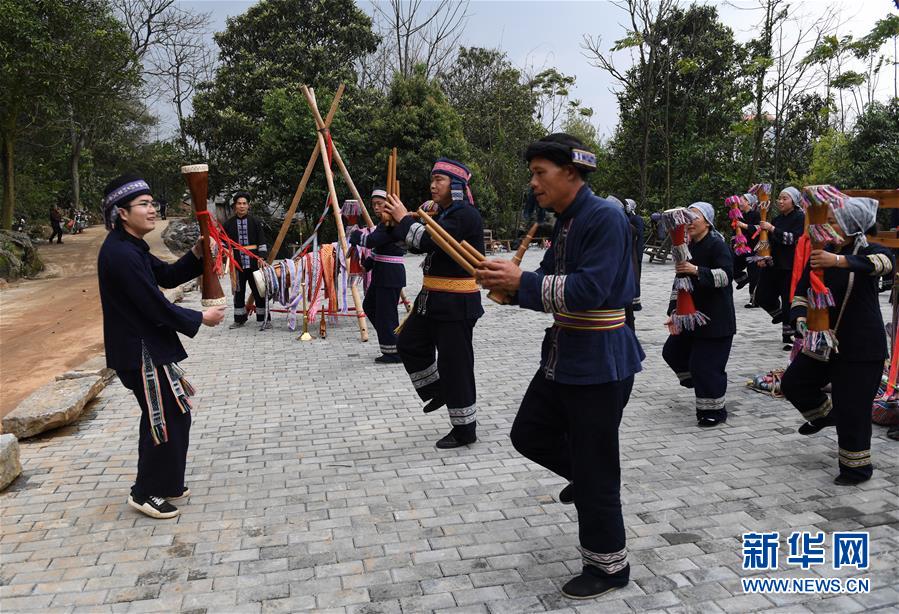 3月19日,在广西富川瑶族自治县葛坡镇青山脚村,徐维生(左一)和瑶族古文化艺术团成员在排练节目。