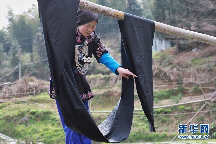3月19日,贵州省锦屏县平秋镇平秋村妇女在晾晒染色后的侗布。侗族刺绣是国家级非物质文化遗产。贵州省锦屏县平秋镇平秋村从2017年起,开办刺绣车间,免费进行缝纫、刺绣培训,培训绣娘近百名,促进绣娘家庭增收,助力脱贫攻坚。 新华社记者欧东衢摄