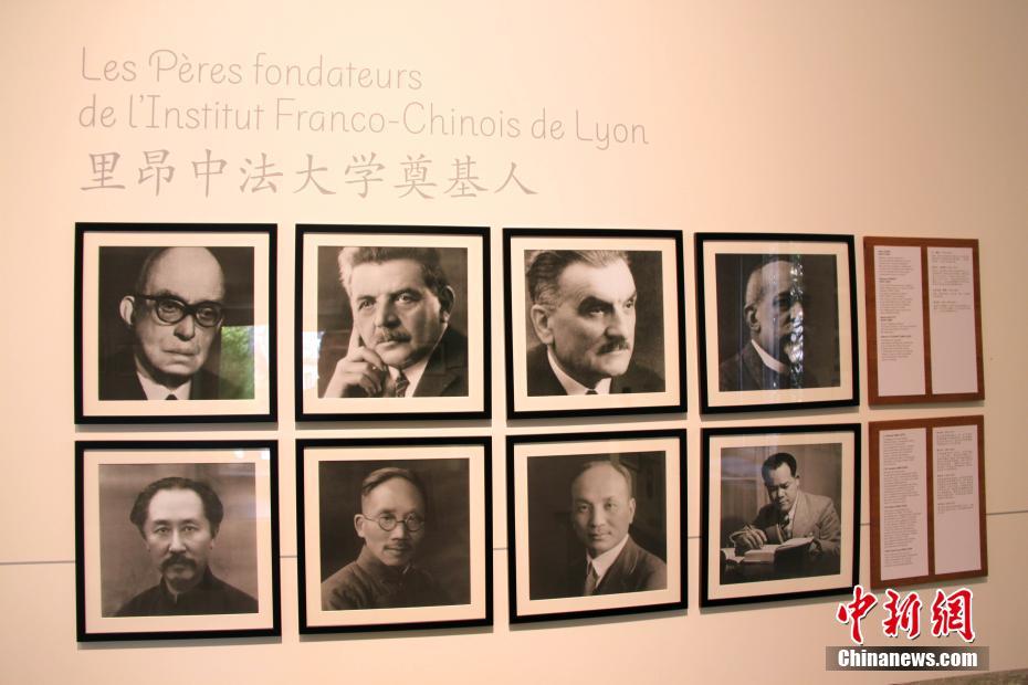 中国国家主席习近平即将对法国展开国事访问。习主席此访正值中法建交55周年和中国留法勤工俭学运动100周年。中新社记者为此专门走访里昂中法大学旧址,探寻在那里诠释中法深厚友谊的动人故事。图为里昂中法大学历史博物馆中展示学校的中法双方奠基人李石曾、蔡元培、埃杜瓦·埃里奥、莫里斯·古恒等人的照片。 中新社记者 李洋 摄