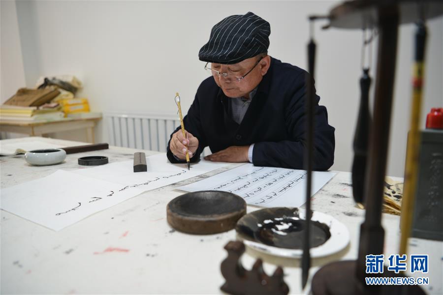 3月20日,在鄂尔多斯市鄂托克旗,包金山在自己的工作室内临帖。 新华社记者邹予摄