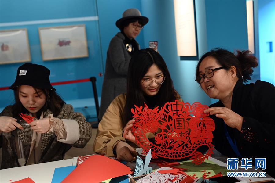3月21日,剪纸艺人辛翠平(右一)指导游客剪纸。 当日,“迎春纳福——山西静乐剪纸互动教育巡展”在北京恭王府开幕,展出超过100件剪纸原作及剪纸相关文创产品。 新华社记者金良快摄