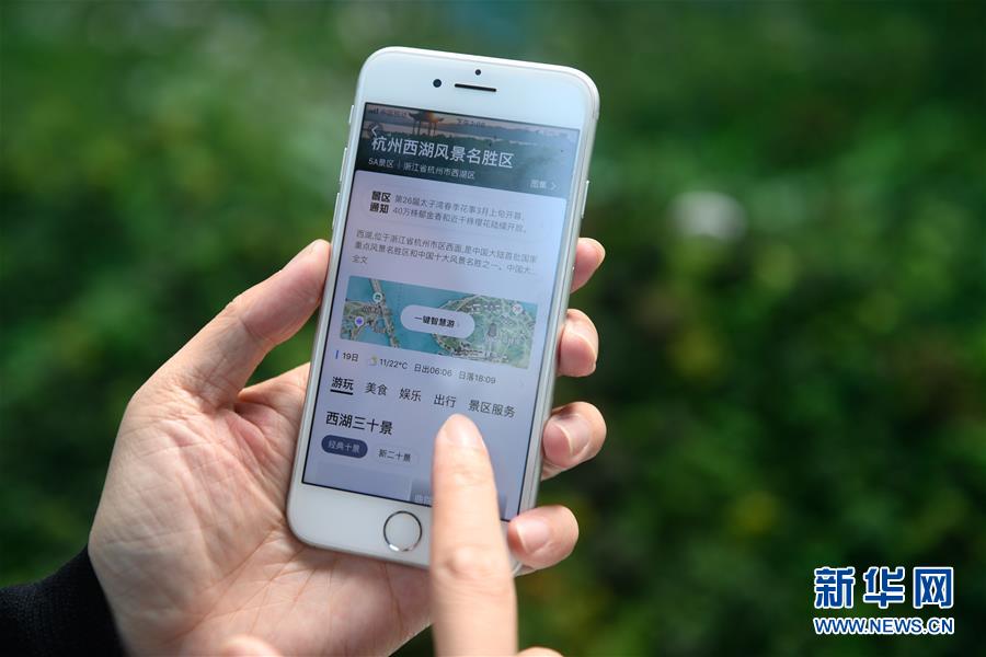 3月19日,在浙江杭州,游客使用手机体验“西湖一键智慧游”服务。 新华社记者 黄宗治 摄