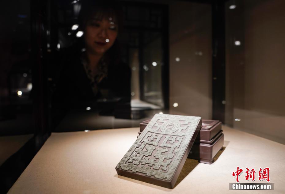 3月21日,“祈福纳祥——辽宁松花石砚制作技艺精品展”在北京恭王府开幕。2014年,松花石砚制作技艺作为辽宁地区珍贵的传统手工技艺类项目,被列入国家级非物质文化遗产代表性项目名录,后又被列入第一批《国家传统工艺振兴目录》。本次展览从松花石砚的传统制作技艺入手,既展出仿制清宫旧藏松花石砚,也有现代创新作品。中新社记者 杜洋 摄