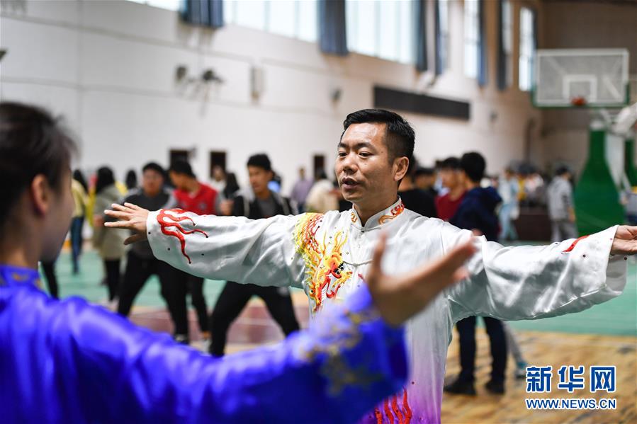 图为3月22日,在湖南中医药大学体育馆,湖南中医药大学传统保健队教练龙专指导学生练习马王堆导引术。