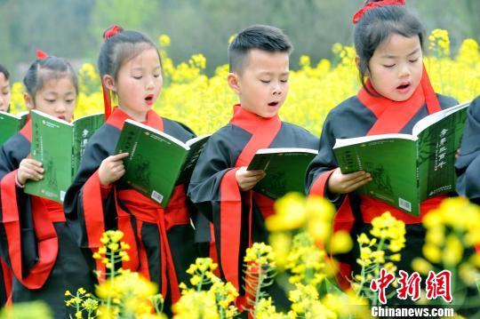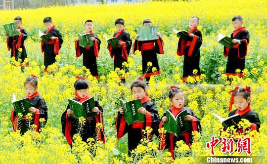 江西省德兴身穿古装的学童,在油菜花海中诵读经典国学。 卓忠伟 摄