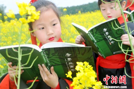 江西省德兴身穿古装的学童,在油菜花海中诵读经典国学,呈现出人花相融、天人合一的美丽画图。 卓忠伟 摄
