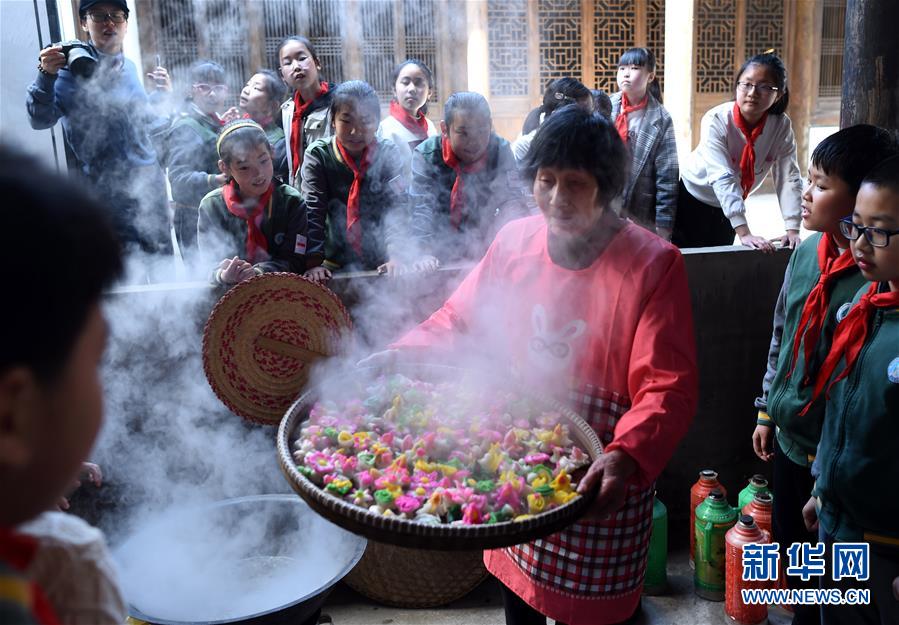 3月26日,诸暨市荣怀学校学生在次坞古村落观看花粿的制作过程。当日,浙江诸暨市荣怀学校和次坞镇中心小学部分师生走进次坞古村落,学习当地传统点心花粿的制作技艺,并通过排演情景剧等形式体验当地清明节习俗。新华社记者 韩传号 摄