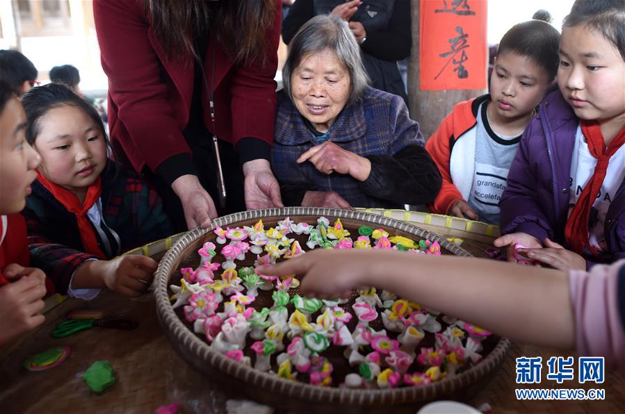 3月26日,学生们在学习花粿制作技艺。当日,浙江诸暨市荣怀学校和次坞镇中心小学部分师生走进次坞古村落,学习当地传统点心花粿的制作技艺,并通过排演情景剧等形式体验当地清明节习俗。新华社记者 韩传号 摄
