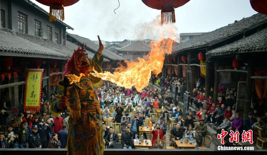 3月26日,一群川剧爱好者走进四川犍为县罗城古镇,为民众和游客带去了一场精彩的民俗文化展示,凉厅下许多民众和游客品茶打牌,欣赏戏楼上精彩的各种表演,尽享人间红尘清福。罗城古镇由于地形原因,从远处看象一只放置在山顶的船,因而被人们称为“山顶一只船”。古镇主街凉厅街俗称“船形街”,街为南北走向,两端较窄,中间宽,街中戏楼高耸,如风帆,而街尾的灵官庙又如船舱。街两侧是老木门、黑屋顶的民居,临街一面的屋檐特别宽大,形成了叫“凉厅子”的罕见长廊,全是穿斗木结构,仿佛船篷。刘忠俊 摄