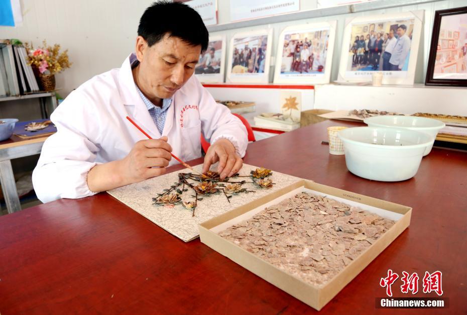3月28日,在青海省海北藏族自治州祁连县,55岁的王忠祥正和工人们将废弃的玉石碎片加工成精美工艺品。经过捡原石、打磨、拼画、粘贴、抛光等工序,一块块不起眼的玉石碎片在王忠祥和工人们的手中变为栩栩如生的人物和花鸟。图为王忠祥为玉石拼画刷胶固定。中新社记者 马铭言 摄