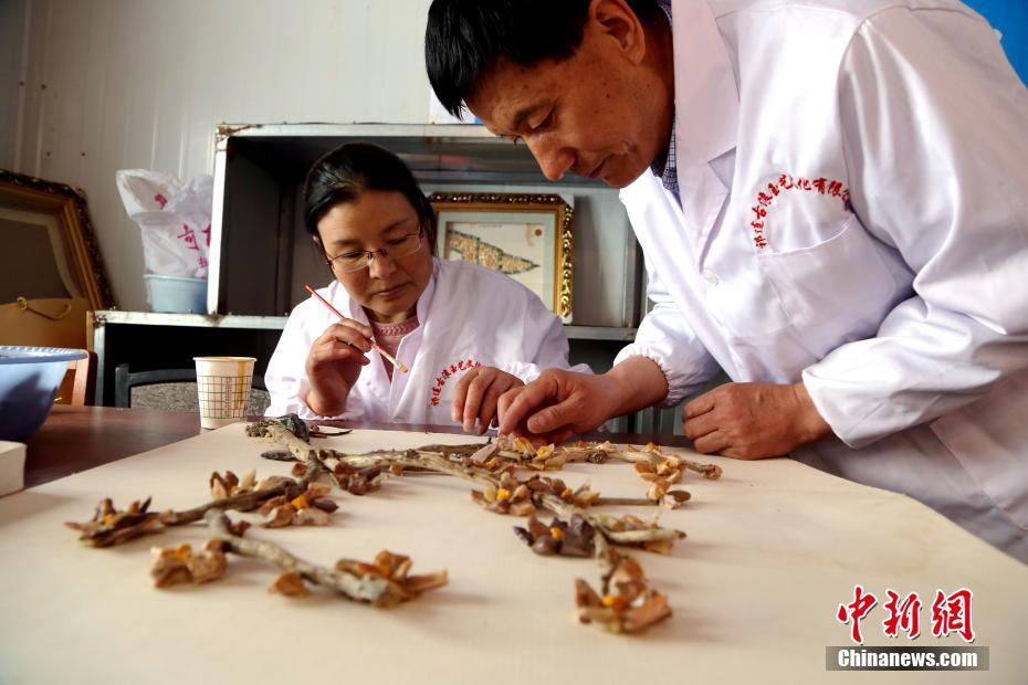 3月28日,在青海省海北藏族自治州祁连县,55岁的王忠祥正和工人将废弃的玉石碎片加工成精美工艺品。经过捡原石、打磨、拼画、粘贴、抛光等工序,一块块不起眼的玉石碎片在王忠祥和工人们的手中变为栩栩如生的人物和花鸟。图为王忠祥指导工人完成玉石拼画。中新社记者 马铭言 摄