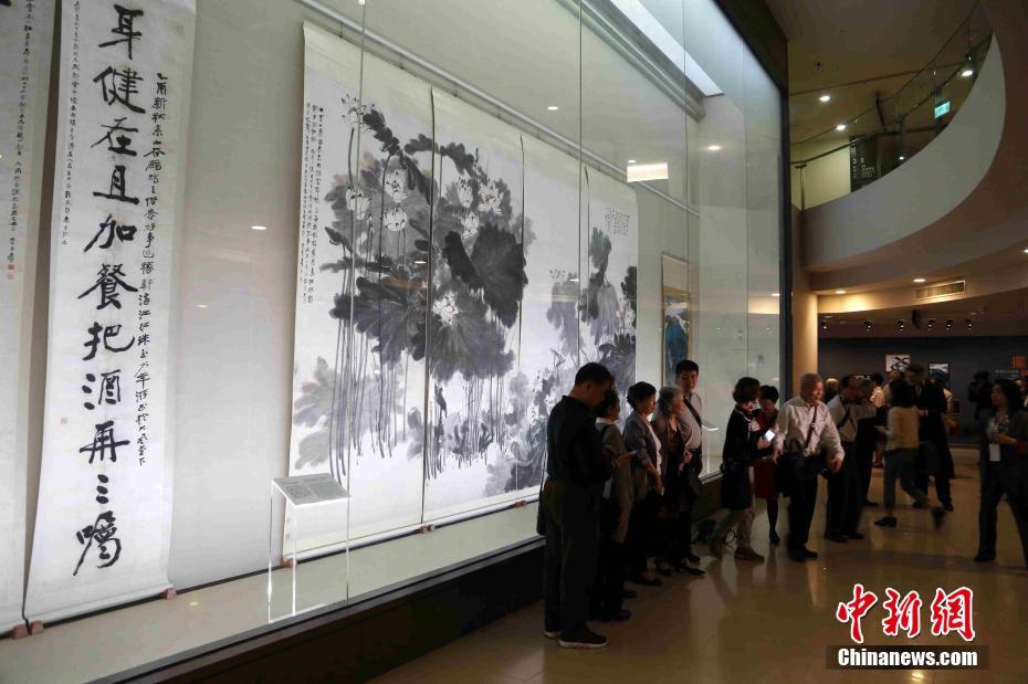 3月29日,“巨匠的剪影——张大千120岁纪念大展”开幕记者会在台北故宫博物院举行。该展将于4月1日至6月25日在台北故宫博物院展出。图为预展中,来宾们在张大千巨幅画作《墨荷四联屏》前留影。中新社记者 毕永光 摄