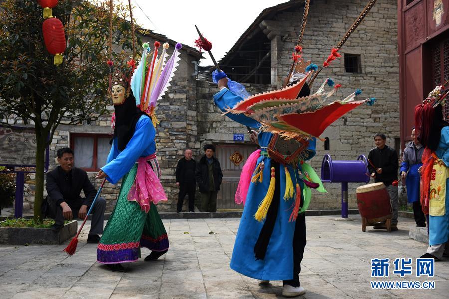 贵州省安顺市西秀区刘官乡周官村的地戏班子在表演《穆桂英大战杨宗保》(3月28日摄)。新华社记者 杨文斌 摄