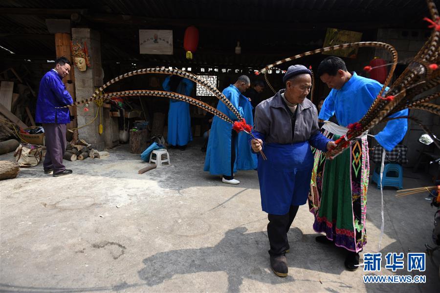 贵州省安顺市西秀区刘官乡周官村的地戏班子在准备道具(3月28日摄)。新华社记者 杨文斌 摄
