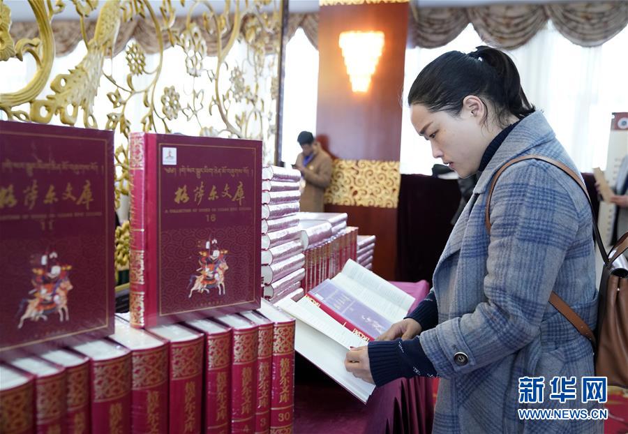 3月29日,媒体记者在发布现场翻阅展示的《格萨尔文库》。 当日,《格萨尔文库》出版发布及捐赠仪式在北京举行。此次出版的《格萨尔文库》,含多民族、多语种的三卷30册,约2500万字,由国家民委所属西北民族大学的几代学者历时20余载完成,对多民族《格萨尔》史诗进行了全方位、多层次整理与研究。 新华社记者沈伯韩摄