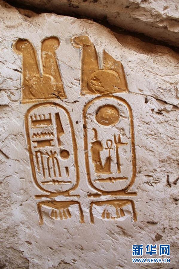 这张未注明拍摄日期的照片显示,在埃及索哈杰省阿拜多斯市,法老拉美西斯二世神庙遗址的砂岩台阶上刻有拉美西斯二世的名字。 埃及文物部28日发布声明说,一支来自美国纽约大学的考古队在埃及南部索哈杰省阿拜多斯市发掘出一处法老拉美西斯二世神庙遗址的大厅、基石和壁画。 新华社发(埃及文物部供图)