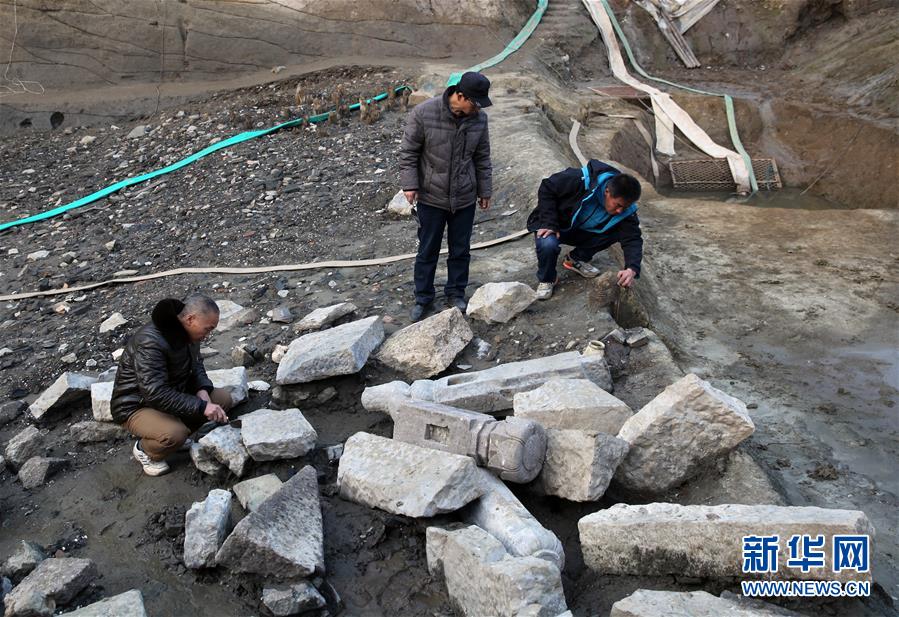 这是考古人员在江苏张家港黄泗浦遗址勘查宋代河道底部的石构件(资料照片)。新华社发