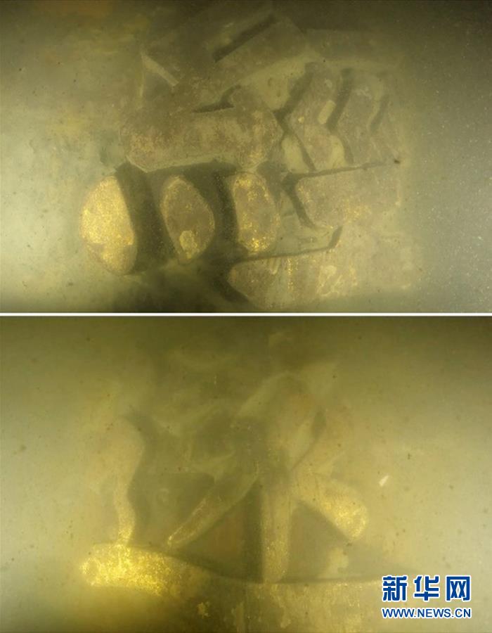 这是辽宁庄河海域甲午沉舰遗址(经远舰)水下考古调查中拍摄的悬挂于“经远舰”舰体舷侧的“经”“远”二字(拼版资料照片)。新华社发