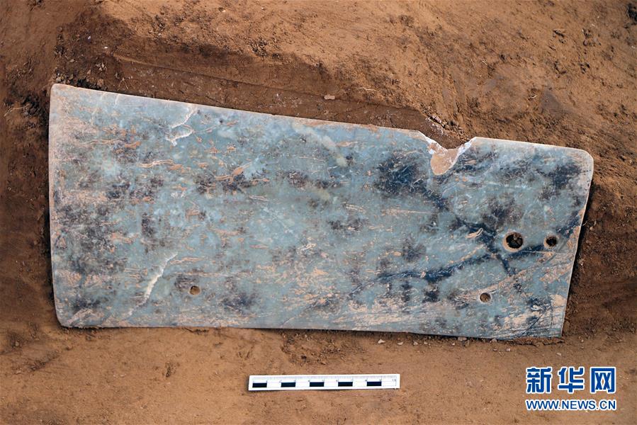 这是陕西延安芦山峁新石器时代遗址营盘梁院落北门外祭祀坑出土大玉刀(资料照片)。新华社发