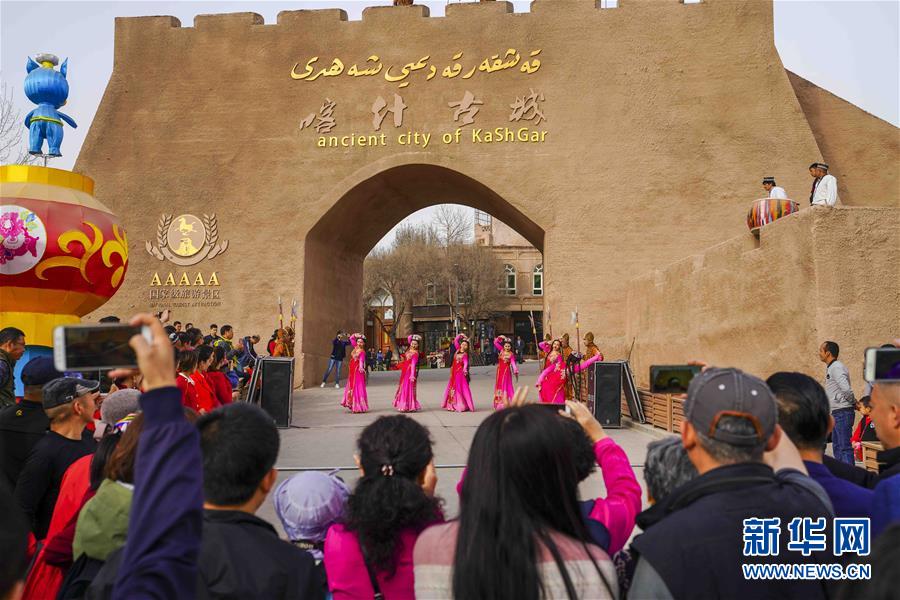 游客在拍摄喀什古城景区的开城仪式(3月30日摄)。 近日,随着气温逐渐升高,新疆南疆地区春意盎然,位于丝绸之路古道上的温宿县托木尔大峡谷、喀什古城景区等地吸引越来越多的游客前来观光游览。 新华社记者 赵戈 摄