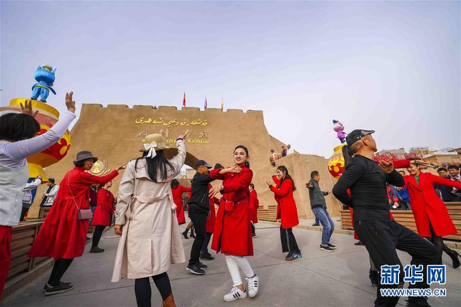 游客在喀什古城景区开城仪式上与工作人员一起互动跳舞(3月30日摄)。 近日,随着气温逐渐升高,新疆南疆地区春意盎然,位于丝绸之路古道上的温宿县托木尔大峡谷、喀什古城景区等地吸引越来越多的游客前来观光游览。 新华社记者 赵戈 摄