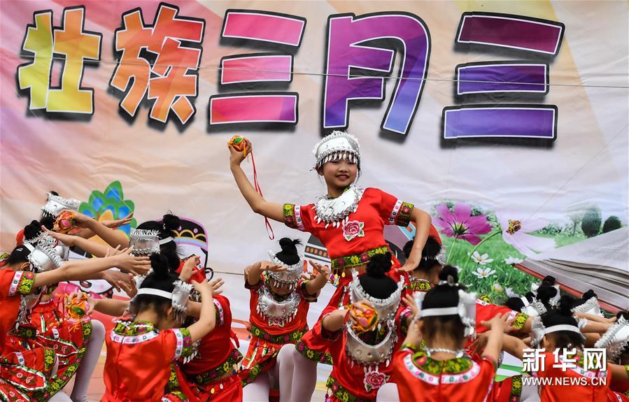 4月2日,钦州市第三十八小学的学生在活动中表演歌舞。 当日,广西钦州市第三十八小学举行“壮族三月三·欢乐嘉年华”系列活动,喜迎“三月三”。 新华社记者 张爱林 摄