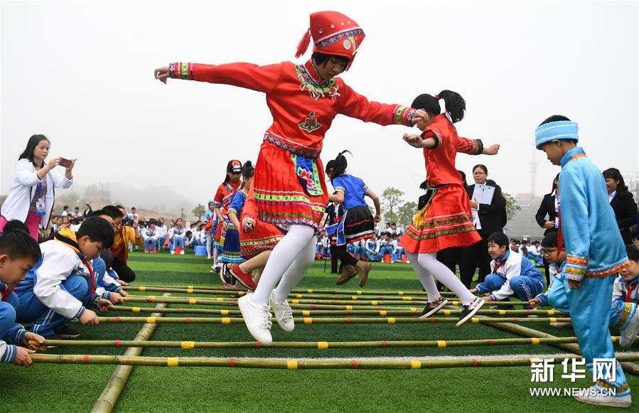 4月2日,钦州市第三十八小学的学生在跳竹竿舞。 当日,广西钦州市第三十八小学举行“壮族三月三·欢乐嘉年华”系列活动,喜迎“三月三”。 新华社记者 张爱林 摄