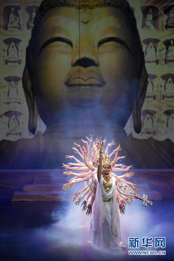 4月2日晚,演员在敦煌大剧院表演舞剧《丝路花雨》。 近日,中国经典舞剧《丝路花雨》旅游版2019年演出季在甘肃省敦煌市敦煌大剧院启动。每晚一场的常态化演出让前来敦煌的中外游客在领略当地风光的同时,能够近距离感受古老敦煌的文化魅力,旅游版《丝路花雨》已成为敦煌“文旅融合”的一张名片。 据了解,《丝路花雨》取材于敦煌莫高窟壁画艺术,自1979年首演至今,已在40多个国家和地区演出2800多场,观众超过400万人次。 新华社记者 陈斌 摄
