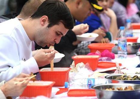 4月3日,在广西柳州市体育中心,外国游客在螺蛳粉长桌宴上品尝螺蛳粉。新华社发(黎寒池 摄)