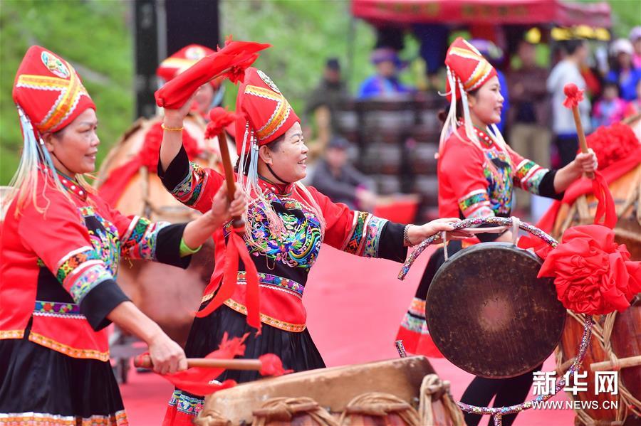 4月3日,在广西大化瑶族自治县县城,身着壮族服饰的演员在排练壮族会鼓。 随着“壮族三月三”假期临近,广西各地陆续开展丰富多彩的民俗活动,喜迎节日。今年的“壮族三月三·八桂嘉年华”活动于3月25日至4月25日举行,在为期一个月的时间内,广西各地举行的各种庆祝活动预计超过900场。 新华社记者黄孝邦摄