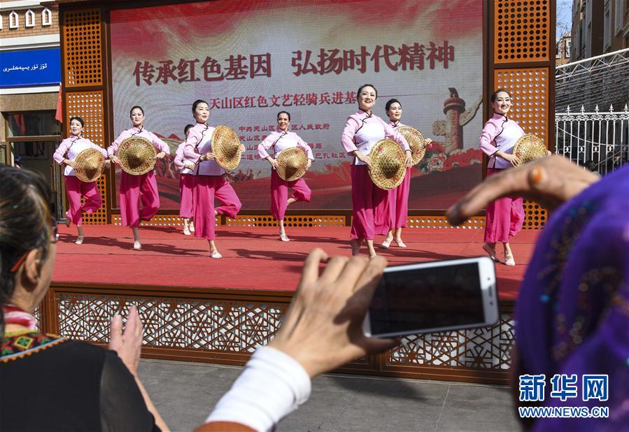 4月4日,在乌鲁木齐市大巴扎步行街,演员在表演舞蹈《沂蒙颂》。 当日,乌鲁木齐市天山区“红色文艺轻骑兵”来到位于乌鲁木齐市的大巴扎步行街,为游客和市民带来一场别开生面的演出。这支队伍由乌鲁木齐市天山区文艺爱好者组成,自2018年3月成立以来,他们深入农村、社区、军营、校园等地,进行了24场专项演出。 新华社记者 王菲 摄
