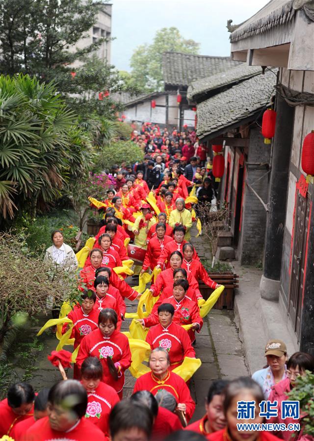 4月4日,当地群众在松溉古镇的街道上表演民俗节目。 当日,为期3天的“我们的节日·清明”暨松溉古镇孝亲文化节在重庆市永川区松溉古镇开幕,通过丰富多彩的民俗文化活动,弘扬“孝”“善”等中华传统美德。 新华社记者 刘潺 摄