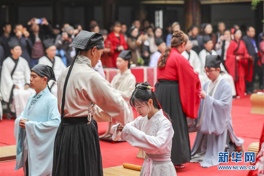 4月4日,参加活动的青年男女按照古礼拜谢长辈。 当日,身着传统服饰的20名适龄青年男女在重庆市永川区松溉古镇举行集体成人礼。 新华社记者 刘潺 摄