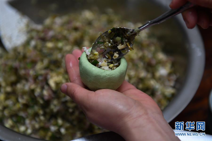 4月4日,移沿山村的村民在为青团裹馅。新华社记者 黄宗治 摄