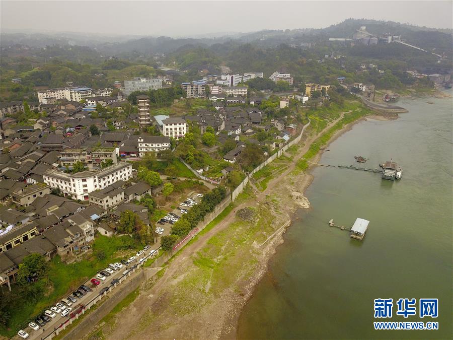 紧邻长江的松溉古镇(4月4日无人机拍摄)。松溉古镇位于重庆市永川区,有着“一品古镇,十里老街,百年风云,千载文脉,万里长江”的美誉。2008年松溉古镇入选第四批国家级历史文化名镇。新华社记者 刘潺 摄