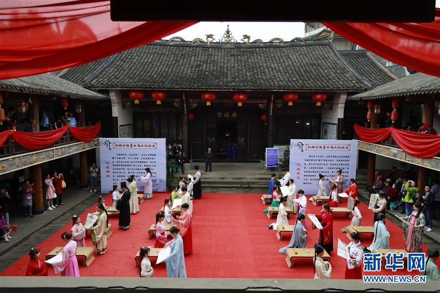 4月4日,在松溉古镇的罗家祠堂内,当地群众在举行集体成人礼。松溉古镇位于重庆市永川区,有着“一品古镇,十里老街,百年风云,千载文脉,万里长江”的美誉。2008年松溉古镇入选第四批国家级历史文化名镇。新华社记者 刘潺 摄