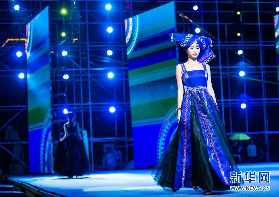 4月5日,模特展示带有布依族服饰元素的设计作品。 当日,2019年望谟“三月三”布依族文化节“锦绣布依”服饰设计大赛在贵州省望谟县王母广场举行。 新华社记者 陶亮 摄