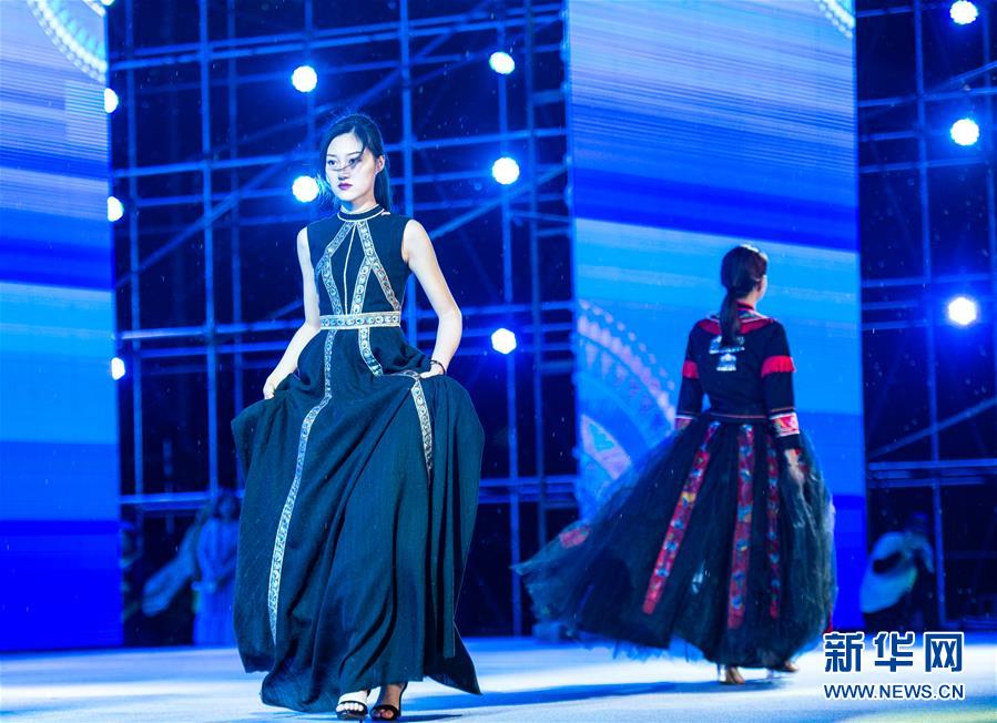 4月5日,模特展示带有布依族服饰元素的设计作品。 当日,2019年望谟“三月三”布依族文化节“锦绣布依”服饰设计大赛在贵州省望谟县王母广场举行。 新华社记者 陶亮 摄
