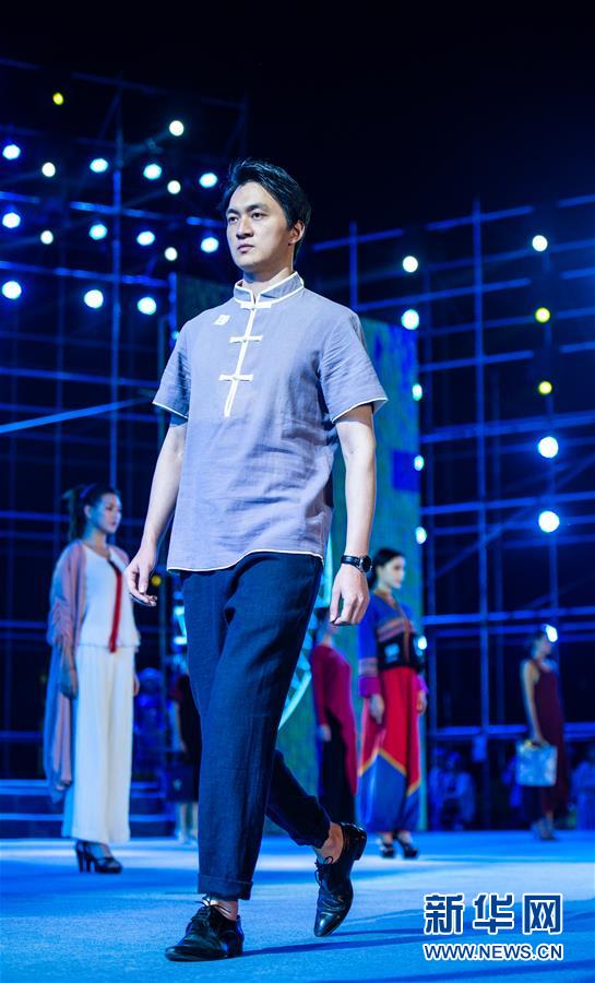 4月5日,模特展示带有布依族服饰元素的设计作品。 当日,2019年望谟“三月三”布依族文化节“锦绣布依”服饰设计大赛在贵州省望谟县王母广场举行。 新华社记者 陶亮 摄