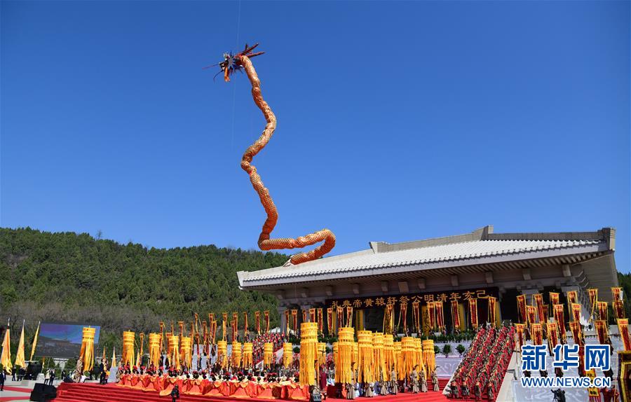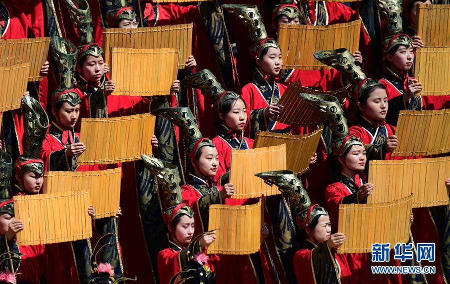 4月5日,演员在公祭轩辕黄帝典礼上表演黄帝祭典乐舞告祭。当日,己亥年清明公祭轩辕黄帝典礼在陕西省黄陵县桥山祭祀广场举行,万余名海内外中华儿女参加仪式。 新华社记者 李一博 摄